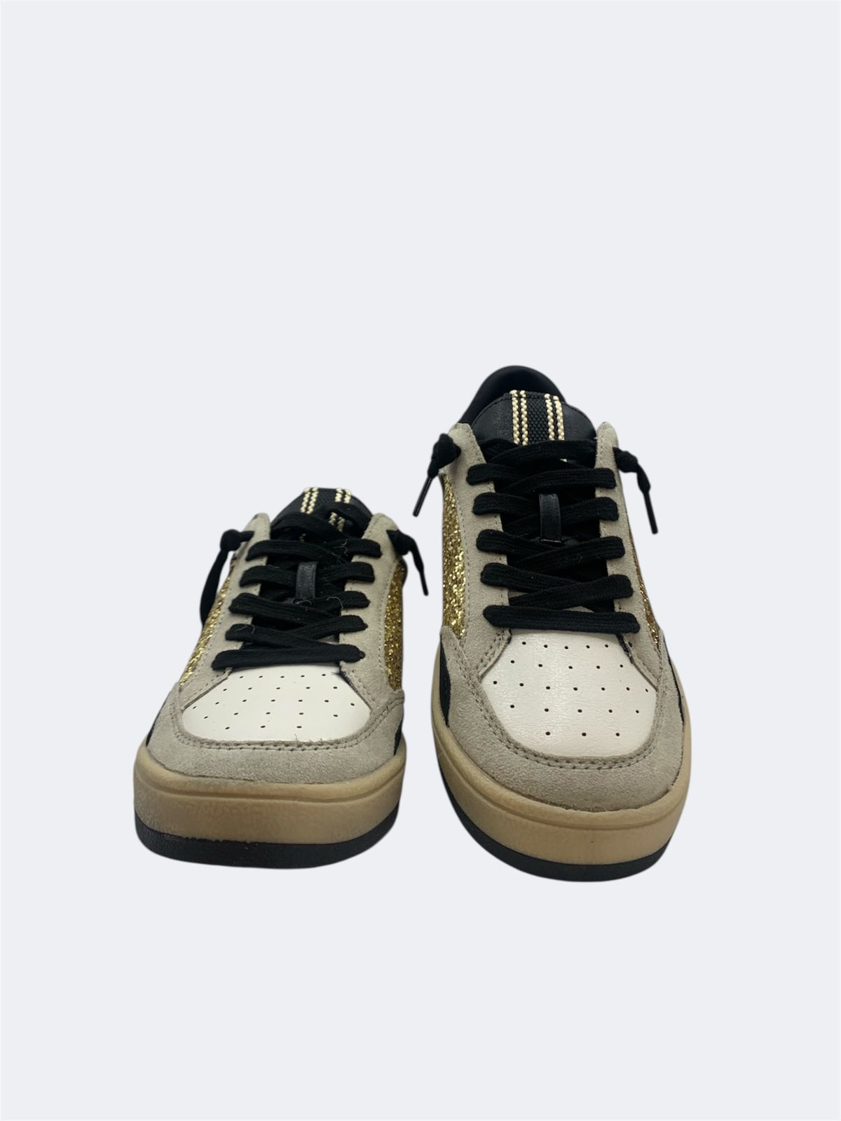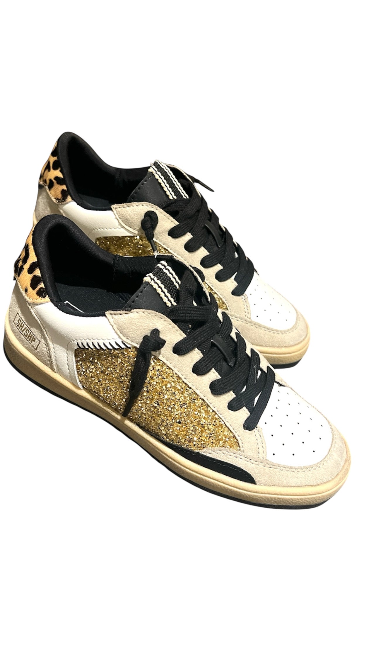 Mix de materiales brillos dorado, suede color cemento, animal print con textura de pelo y juego de agujetas adicional